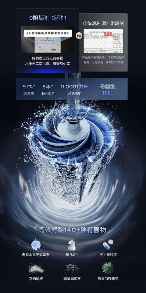 很多人不知道,部分净水器会在滤芯里添加磷酸盐类阻垢剂,目的是减少水垢堵塞、让滤芯 “看起来更耐用”。但这些化学物质无法完全过滤,会随着饮用水进入人体。虽然短期喝可能没明显不适,但长期累积会增加代谢负担,尤其对母婴这类敏感人群,风险更高。更让人担心的是,多数品牌不会主动告知添加了阻垢剂,消费者只能被动 “踩坑”。美的 0 阻垢剂:靠技术而非化学剂,安全有实锤